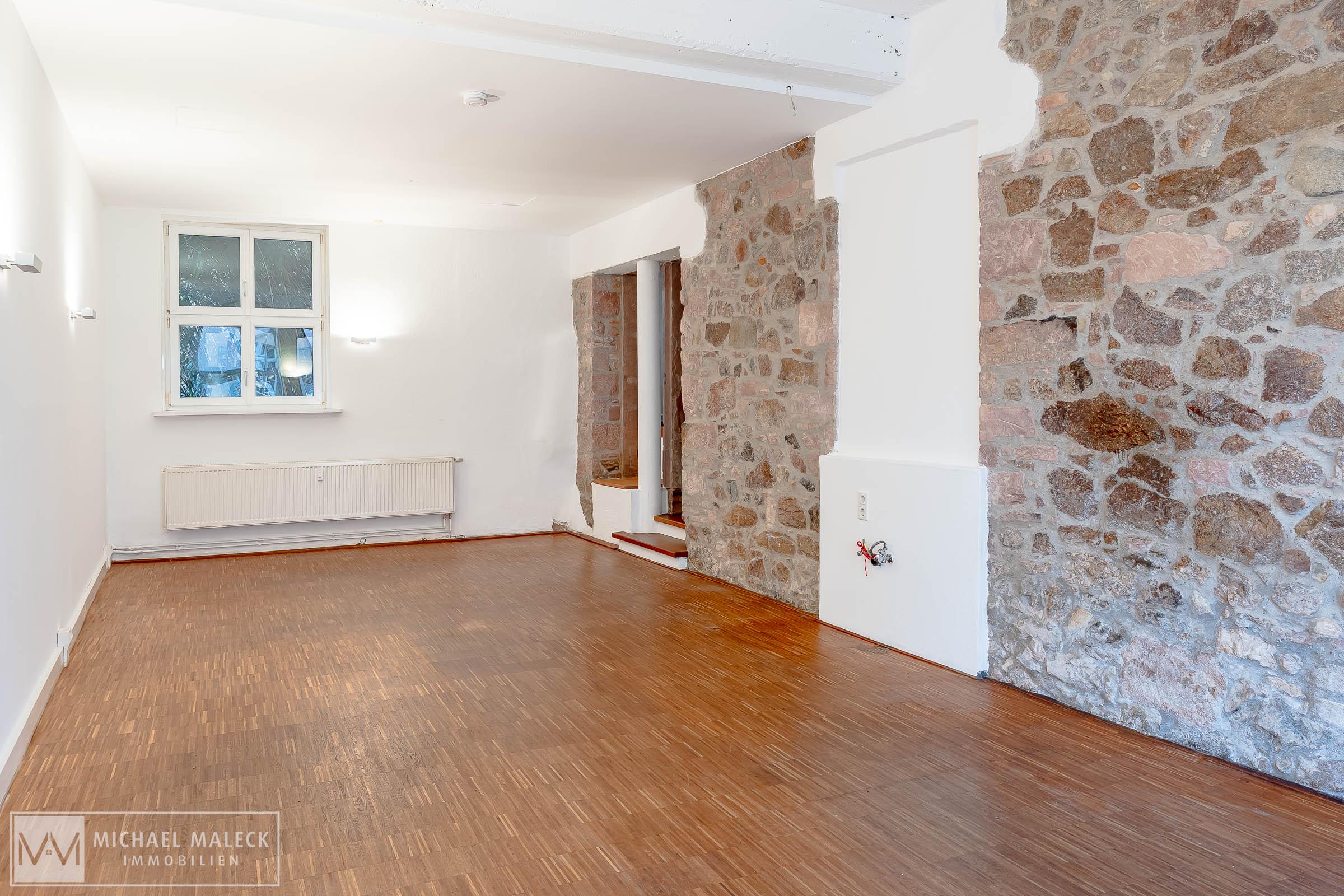 • sehr großzügiger Empfangsraum mit rustikalen Steinwänden und warmem Parkettboden