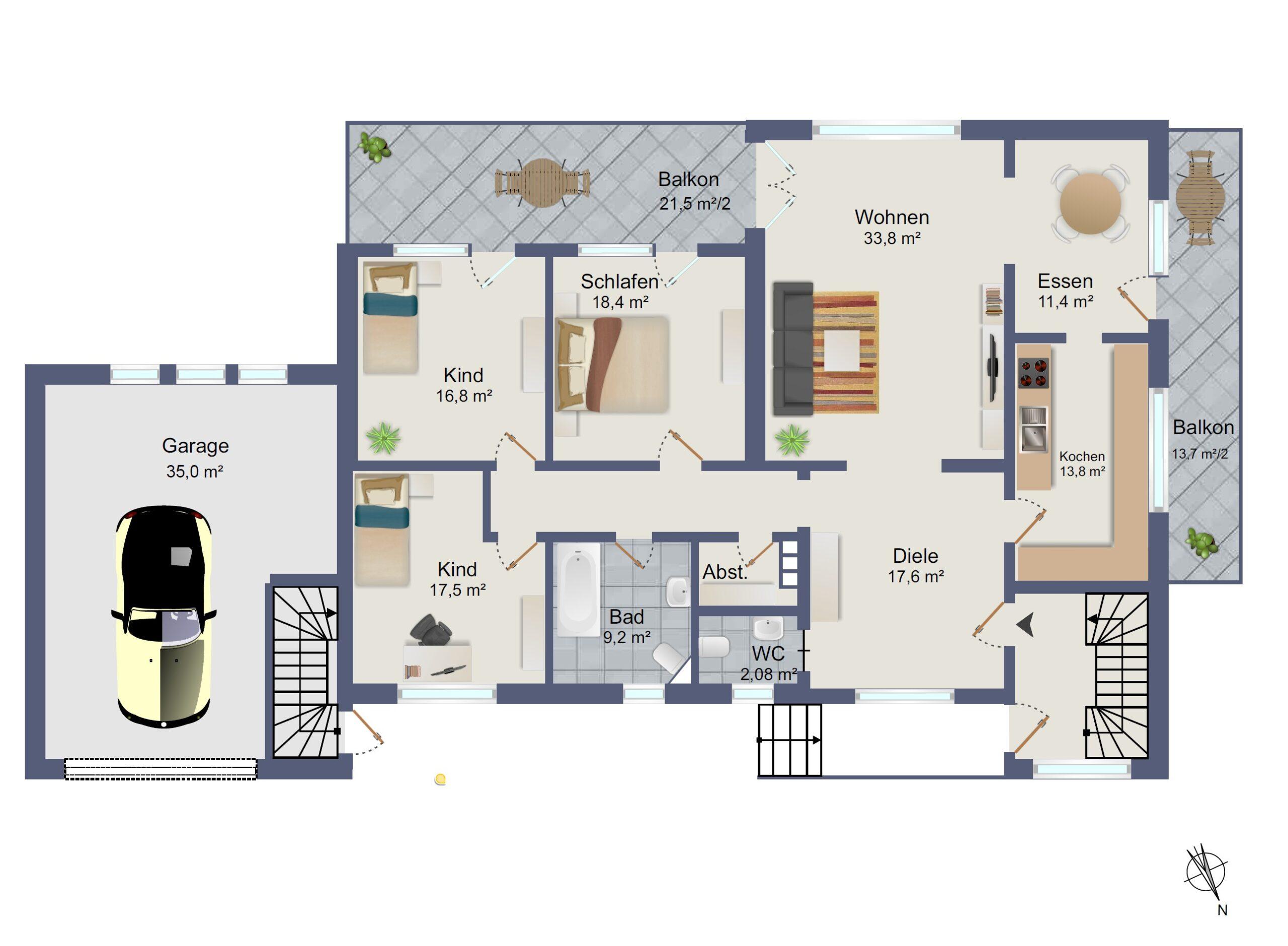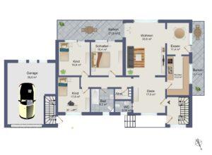 - 2 Garagenplätze (beheizt, jeweils ca. 35 m²)